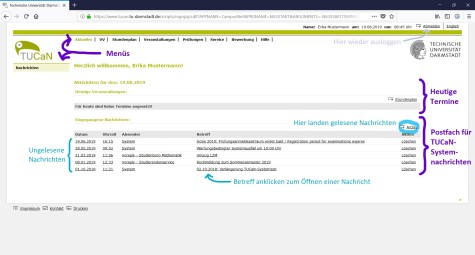 Über TUCaN kannst du das Vorlesungsverzeichnis einsehen, dich zu Veranstaltungen (= Vorlesung, Übung, Tutorium etc.) und Prüfungen anmelden, deinen Stundenplan einsehen (und deine Adresse ändern). Auch versendet es wichtige Systemnachrichten und manche (Nebenfach-)Veranstaltungen verteilen ihr Material darüber.