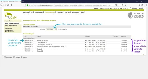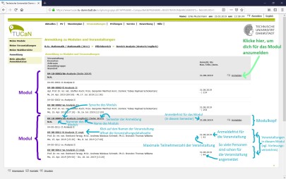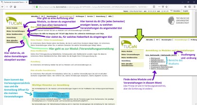 - Damit Veranstaltungen in deinem Stundenplan auftauchen, musst du dich für diese über TUCaN anmelden (siehe unten). Die Veranstaltungsdetailsseite ist die Seite, auf der ggf. zur Veranstaltung bereitgestelltes Material zugänglich ist (in der Mathematik kommt es selten vor, aber in manchen Nebenfächern wird das gerne verwendet).