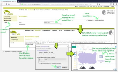- Unter Stundenplan findet sich wie nicht anders zu erwarten dein Studenplan. TUCaN handhabt Stundenpläne auf Terminbasis, d.h. z.B. eine Veranstaltung, die montags im zweiten Zeitslot liegt, hat an jedem Montag der Vorlesungszeit einen Termin von 9:50 bis 11:30 im entsprechenden Raum. Auf diese Weise werden auch direkt Feiertage, Raumänderungen etc. berücksichtigt.