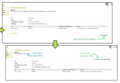 Ähnlich wie bei den Veranstaltungen kannst du dich hier nun für die Prüfungen anmelden. Dabei muss die Prüfungsanmeldung immer auch abgeschickt werden. Sobald du dies getan hast, sollte die Prüfung in der Prüfungsübersicht unter “Meine Prüfungen” auftauchen.