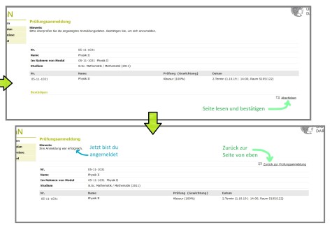 In der Mathematik werden (erfolgreich durchgeführte) Anmeldungen zu Veranstaltungen/Modulen i.A. automatisch akzeptiert. Die Seite “Mein aktueller Anmeldestatus” ist hierzu also nicht besonders interessant (außer, dass du dich darüber auch wieder abmelden kannst). Hast du dich allerdings z.B. im Studium Generale für einen Sprachkurs angemeldet, kannst du über diese Seite das Ergebnis des Losverfahrens einsehen.