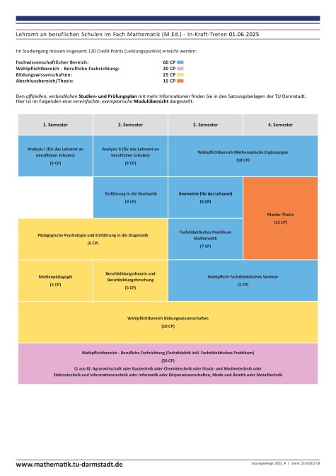 Der Studiengang Lehramt an beruflichen Schulen mit dem Abschluss Master of Education ist auf eine Regelstudienzeit von 4 Semestern ausgelegt und umfasst Studienleistungen im Umfang von 120 Credit Points. Er schließt mit einer Master-Thesis ab.